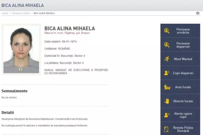 1. BICA Alina Mihaela, urmarita international in baza Mandatului European de Arestare emis de catre Tribunalul Bucuresti, pentru favorizarea faptuitorului. Aceasta are de executat 4 ani închisoare.