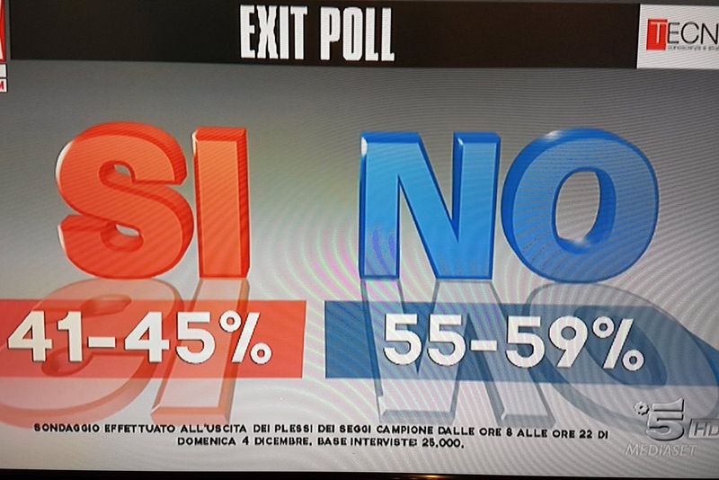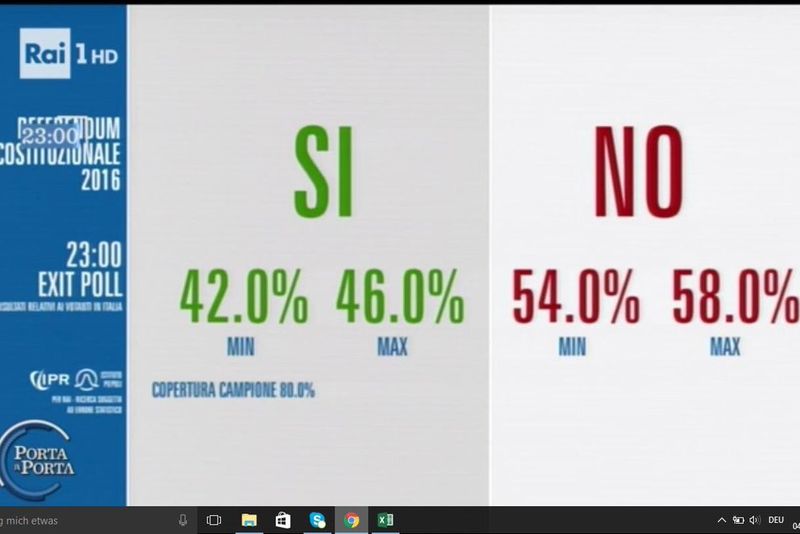 Un alt exit-poll prezentat de RaiNews oferă rezultate similare: pentru NU: 54.0%-58.0%, în timp ce voturile pentru DA sunt mult mai puține: 42.0%-46.0%.