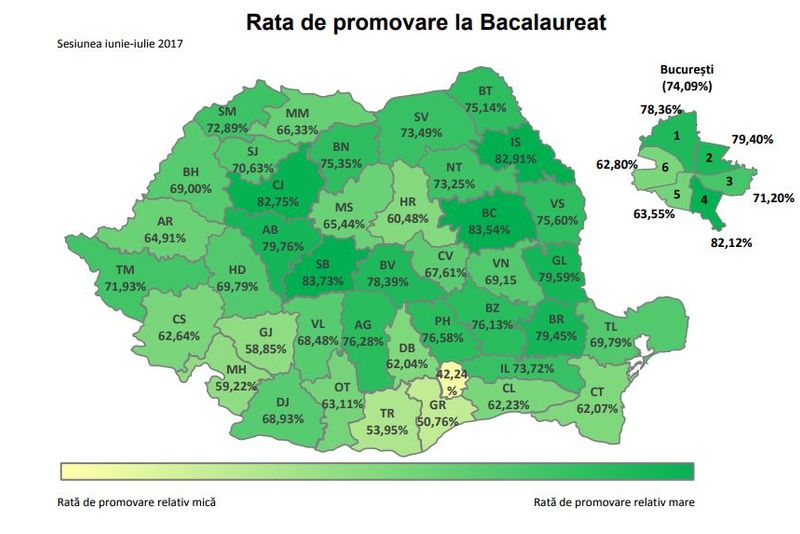 Rata de promovare în Capitală este de 74,09%. Judeţele în care ratele de promovare au fost sub 55% sunt Ilfov (42,24%), Giurgiu (50,7%) și Teleorman (53,95%).