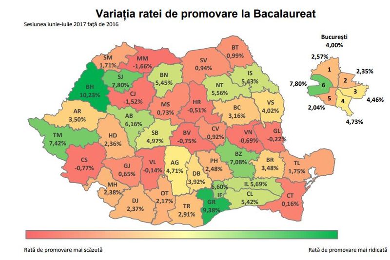 O altă statistică oferită de EDU.ro ne arată cum și-au îmbunătăți sau înrăutățit județele performanțele la BAC. Spre exemplu, rata de promovare a fost mai bună anul acesta în Bihor sau Giurgiu.
