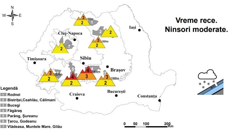 Și în Parâng-Șureanu, la peste 1800 m, a nins consistent în ultimele 24 de ore, iar în ultimele zile s-au acumulat local peste 40-50 cm de zăpadă. În profunzime întâlnim stratul vechi și compact, cu cruste de gheață în interior. Pe pantele suficient de înclinate, stratul de zăpadă recent depus din partea superioară va putea aluneca peste cel vechi și compact, ducând la declanșarea spontană a unor avalanșe de dimensiuni medii și izolat mari, riscul fiind amplificat la supraîncărcări oricât de slabe. În apropierea crestelor va exista riscul ruperii cornișelor.