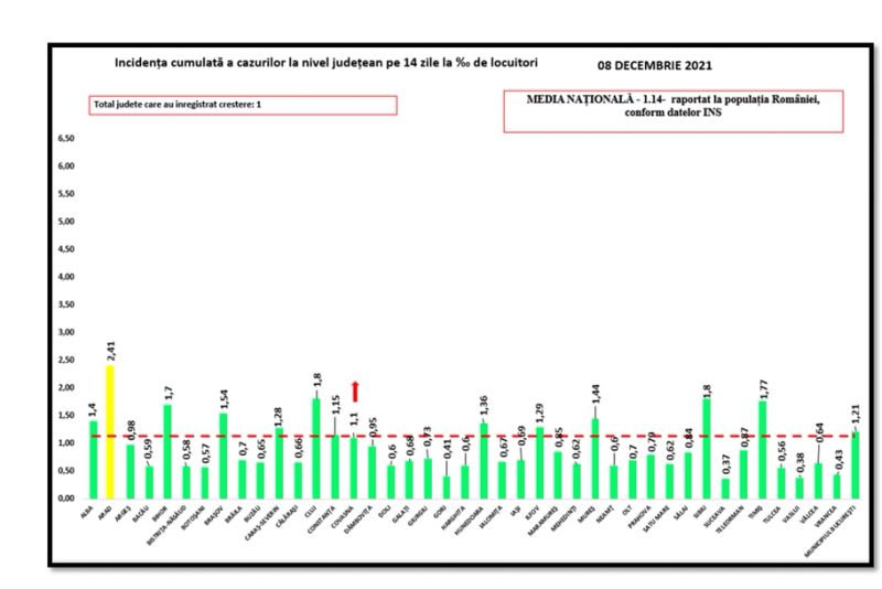 Media națională a infectărilor cu COVID-19 a ajuns, astăzi, la 1,14. În continuare, un singur județ se mai află în scenariul galben. Este vorba despre Arad, care are o incidență de 2,41, în scădere față de ziua de ieri.