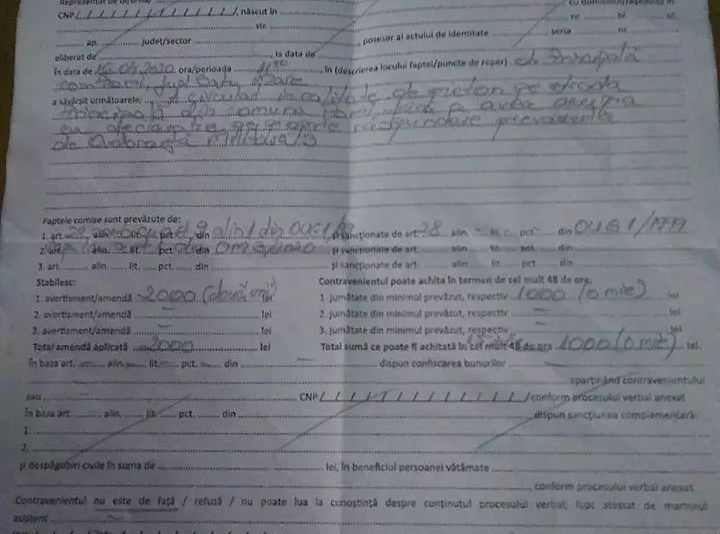 ”Mulțumim domnului șef de post (…) pentru amenda dată soției mele cu ocazia în care porcul din gospodărie a fugit pe stradă și soția mea n-a apucat să ia declarația pe propria răspundere, încălcând astfel ordonanța militară: 2.000 de lei”, este mesajul bărbatului.