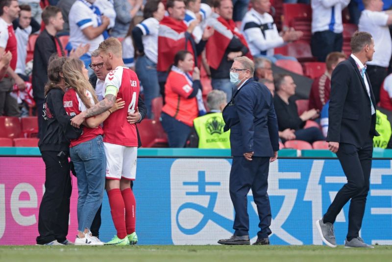 Un jucător de fotbal din echipa Danemarcei a căzut secerat pe teren. El a fost resuscitat pe gazon. Ulterior a fost scos de pe teren de către echipa medicală și de către colegii săi în timp ce soția sa privea îngrozită imaginile de pe marginea terenului.