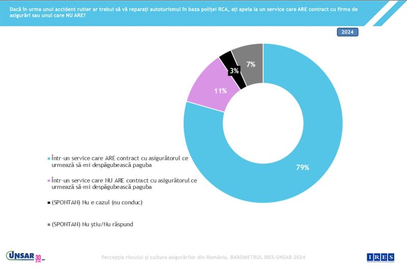 79% dintre șoferii români păgubiți ar apela la un service care are contract cu asigurătorii, în cazul în care ar avea nevoie să își repare mașina în baza poliței RCA în urma unui accident rutier produs din vina altui conducător. În același timp, doar 11% dintre românii păgubiți ar apela la un service care nu are contract cu asigurătorii, rezultă din cel mai recent Barometru UNSAR – IRES.
