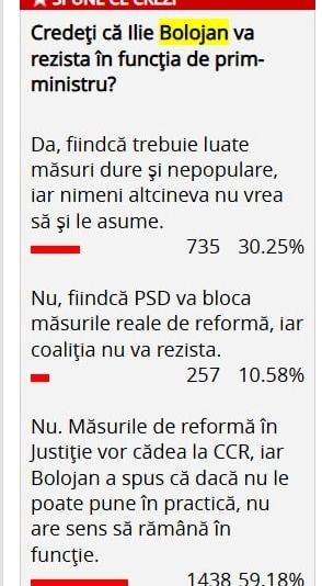 încă de pe vremea când acesta era primarul municipiului Oradea, a realizat un sondaj de opinie în care i-a întrebat pe cititori dacă sunt de părere că actualul premier va rezista în fruntea Guvernului.Chiar dacă întrebările au încercat să îl pună pe șeful Executivului într-o lumină bună, 69,38% dintre repondenți s-au declarat mai degrabă sceptici.