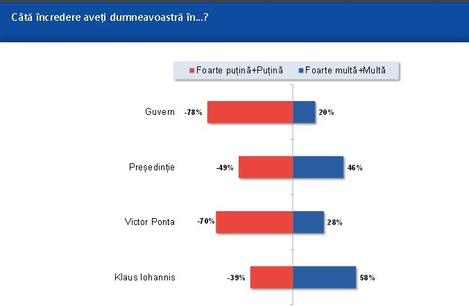 Potrivit IRES, 78% din repondenţi spun că au foarte puţină şi puţină încredere în Guvern, în timp ce 49% îşi manifestă neîncrederea în Preşedinţie.