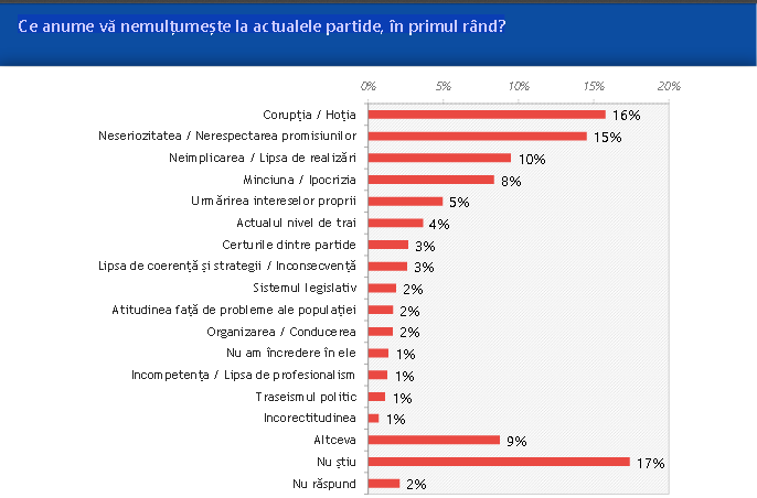 La întrebarea "Ce anume vă nemulțumește la actualele partide, 16% au spus Coruţia, 15% neseriozitatea, 10% neimplicarea.