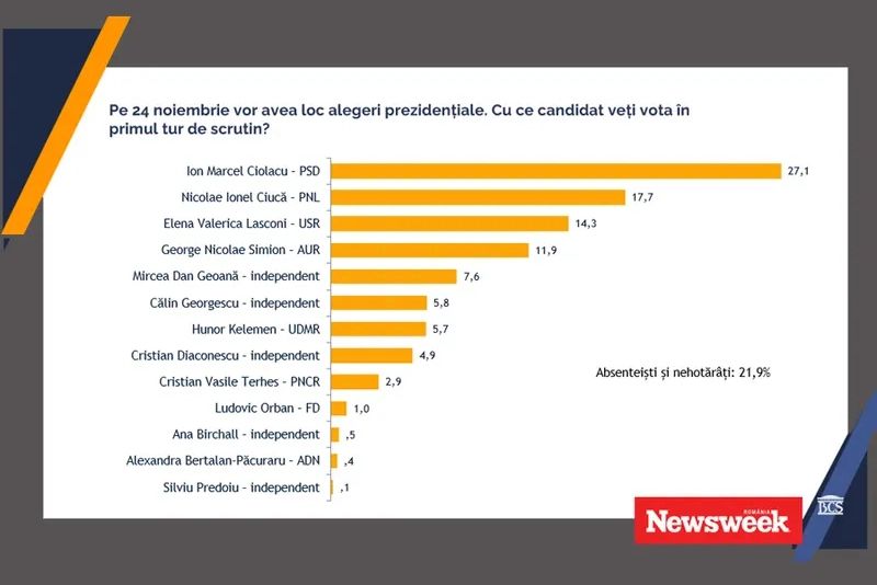 Un ultim sondaj de opinie, realizat la comanda Newsweek, arată că Marcel Ciolacu va câștiga primul tur al alegerilor prezidențiale care au loc pe 4 noiembrie. Pe poziția a doua este Nicola Ciucă, liderul PNL.