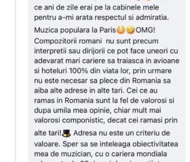 Între timp, comentariul lăsat la postarea lui Măcelaru a fost şters. Soprana a avut în trecut mai multe luări de poziție în care și-a exprimat opinia că artiști precum George Enescu, Maria Tănase dau Ciprian Porumbescu sunt supraevaluați.