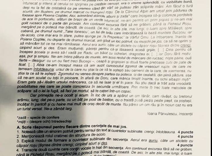 Subiecte + barem Romana 2018. „Din fericire, nu mai e nevoie ca elevii să înveţe citate din cărţi ori comentarii întregi, aşa cum se făcea odată. Examenul are doar caracter aplicativ. Tot ce au învăţat teoretic trebuie aplicat pe texte la prima vedere. Acum, accentul se pune pe latura practică a limbii. Limba nu e un panou de onoare la care te uiţi cu respect. E o haină pe care o porţi cu tine zi de zi şi trebuie să o porţi frumos. Copiilor li se cere să-şi exprime opinia, să interpreteze conform noţiunilor însuşite până în prezent, să poată evalua un text minimal", sunt sfaturile profesoarei de limba română.