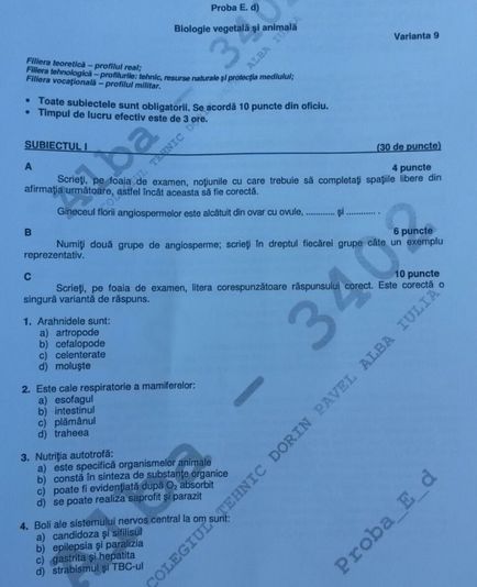 Subiecte Bac 2016 BIOLOGIE . Subiectele pentru probele de evaluare a competentelor lingvistice de comunicare orală în limba română, respectiv în limba maternă sunt elaborate de Centrul Național de Evaluare și Examinare și cuprind texte literare și nonliterare, funcționale și nonfuncționale, cu un grad de complexitate care să permită tratarea lor integrală în maximum 10-15 minute. Rezultatul obținut de fiecare candidat la proba de evaluare a competențelor lingvistice de comunicare orală în limba română, respectiv în limba maternă nu se exprimă prin note sau prin calificativ admis/respins, ci prin stabilirea nivelului de competență corespunzător grilei aprobate la nivel național: experimentat, avansat și mediu. Candidatul care refuză să raspundă sau să rezolve subiectele propuse la una din probele de evaluare a competențelor lingvistice și digitale se consideră că nu a susținut proba.