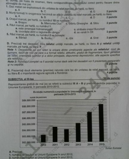 Subiecte Bac 2016 GEOGRAFIE. Subiectele pentru probele de evaluare a competentelor lingvistice de comunicare orală în limba română, respectiv în limba maternă sunt elaborate de Centrul Național de Evaluare și Examinare și cuprind texte literare și nonliterare, funcționale și nonfuncționale, cu un grad de complexitate care să permită tratarea lor integrală în maximum 10-15 minute. Rezultatul obținut de fiecare candidat la proba de evaluare a competențelor lingvistice de comunicare orală în limba română, respectiv în limba maternă nu se exprimă prin note sau prin calificativ admis/respins, ci prin stabilirea nivelului de competență corespunzător grilei aprobate la nivel național: experimentat, avansat și mediu. Candidatul care refuză să raspundă sau să rezolve subiectele propuse la una din probele de evaluare a competențelor lingvistice și digitale se consideră că nu a susținut proba.