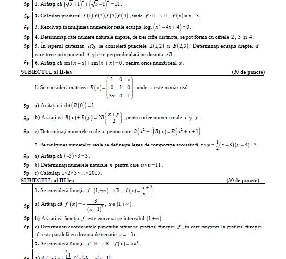 BACALAUREAT 2016 SUBIECTE MATEMATICĂ. Extrem de important este faptul că, potrivit metodologiei de EXAMEN, candidaţii NU pot intra în săli cu manuale, dicţionare, notiţe, însemnări şi alte materiale care ar putea fi utilizate pentru REZOLVAREA SUBIECTELOR, şi nici cu telefoane mobile sau căşti audio.