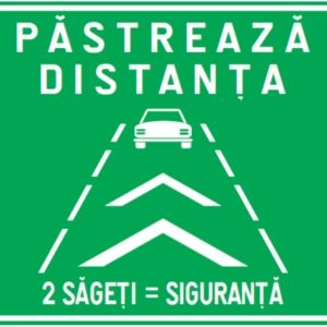 În partea de sus scrie „PĂSTREAZĂ DISTANȚA”, iar în partea de jos „2 SĂGEȚI = SIGURANȚĂ”.