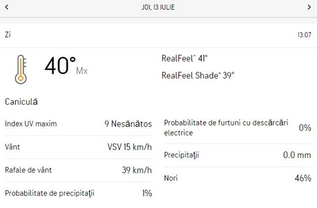 Meteorologii Accuweather anunță că joi, în București, vor fi 40 de grade Celsius. Temperatura resimțită va fi, însă, ceva mai mare, de 41 de grade Celsius.