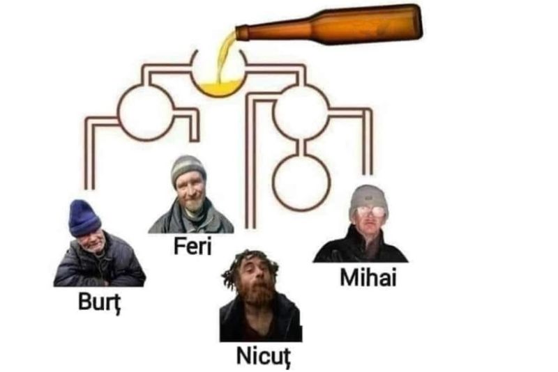 În ceea ce privește ceilalți trei doritori, Burț, Feri și Mihai, aceștia vor rămâne „cu buza umflată” cum se spune în limbaj colocvial, întrucât băutura nu va ajunge la ei. O atentă privire asupra instalației arată că drumul alcoolului spre ei este oprit de diverse obstacole.