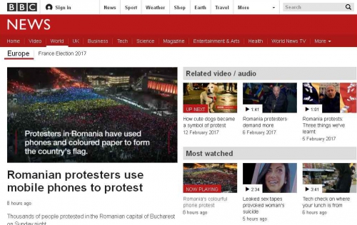 BBC preia în ediţia electronică imagini cu imensul Tricolor uman creat de manifestanţii din Piaţa Victoriei şi vorbeşte depre "protestul colorat cu telefoanele mobile". "Protestatarii români au folosit telefoanele mobile şi hârtii colorate pentru a crea steagul ţării", titrează postul britanic de ştiri.