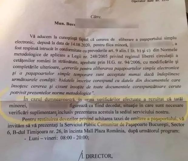 "Vă aducem la cunoștință faptul că cererea de eliberare a pașaportului simplu electronic, depusă la data de 14.08.2020, pentru fiica minoră, a fost respinsă. (...) În cazul dumneavoastră, în urma verificărilor efectuate a rezultat că tatăl minorei figurează ca fiind decedat, situație în care sunt necesare verificări suplimentare, inclusiv prezentarea acestuia la sediul serviciului nostru", se arată în înștiințarea primită de femeia din București, potrivit antena3.ro.