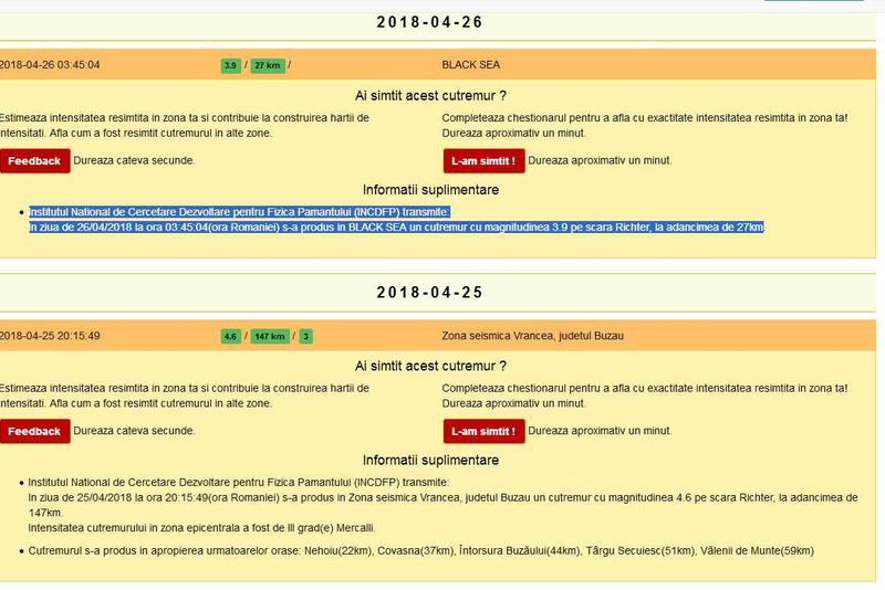 Institutul National de Cercetare Dezvoltare pentru Fizica Pamantului (INCDFP) transmite:In ziua de 26/04/2018 la ora 03:45:04(ora Romaniei) s-a produs in BLACK SEA un cutremur cu magnitudinea 3.9 pe scara Richter, la adancimea de 27km.
