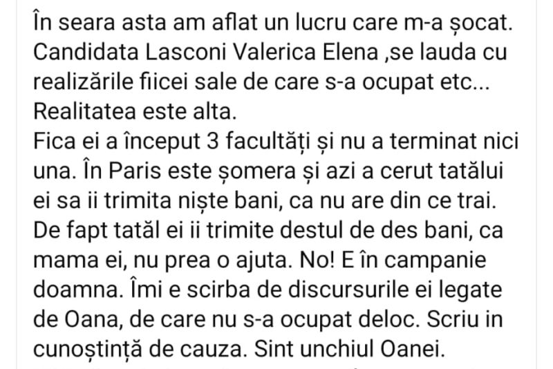 "În seara asta am aflat un lucru care m-a șocat. Candidata Lasconi Valerica Elena se lauda cu realizările fiicei sale de care s-a ocupat etc.. Realitatea este alta.