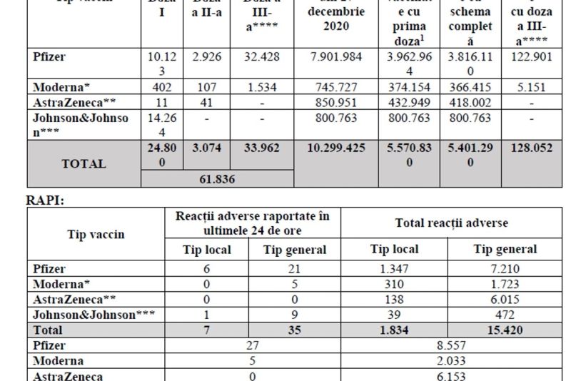 În ultimele 24 de ore au fost vaccinate peste 61.836 de persoane, din care 24.800 cu prima doză sau doza unică Johnson & Johnson, vaccin administrat o singură dată. Alte aproape 33.962 de persoane au fost vaccinate cu doza a treia - booster.