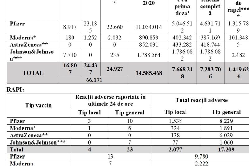 Bilanț 24 noiembrie – evidența persoanelor vaccinate împotriva COVID-191. Persoane vaccinate în ultimele 24 de ore: 66.171;2. Persoane vaccinate cu prima doză în ultimele 24 de ore: 16.807;3. Total persoane vaccinate: 7.668.218;4. Persoane vaccinate cu schemă completă: 7.283.706;5. Persoane vaccinate cu doza de rapel: 1.419.624;6. Total doze administrate din 27 decembrie 2020: 14.585.468.În ultimele 24 de ore au fost raportate doar 27 de reacții adverse ușoare, de tip general, cele mai multe în cazul administrării vaccinului Pfizer.În prezent, 204 reacții adverse sunt în curs de investigare. Nu au fost raportate cazuri severe.Potrivit datelor puse la dispoziția Comitetului Național de Coordonare a Activităților privind Vaccinarea împotriva COVID-19 (CNCAV) de către Institutul Național de Sănătate Publică (INSP-CNSCBT), prin aplicația Registrul Electronic Național al Vaccinărilor (RENV), care ține evidența vaccinărilor, situația din ziua de 24 noiembrie a.c., ora 17.00, este următoarea: