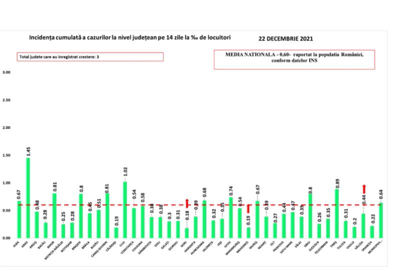 Media națională a infectărilor cu COVID-19 a ajuns la 0,60, în scădere față de ziua pregedentă, când a fost raportată o medie de 0,62. În prezent, întreaga țară continuă să se afle în scenariul verde. Capitala și Județul Ilfov se mențin și ele sub pragul de 1 la mie.