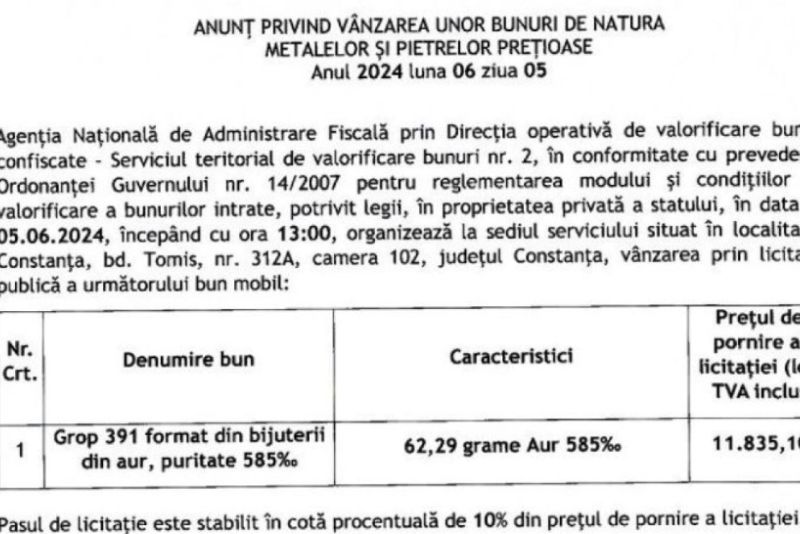 Agenția Națională de Administrare Fiscală încearcă să recupereze prejudiciile provocate de firmele evazioniste sau de diverși infractori, prin scoaterea la licitație a bijuteriilor confiscate de la aceștia și ulterior ajunse în posesia statului. Instituția de control a lansat o procedură de licitație pentru intermediul căreia vinde aproximativ 62 de grame de aur la prețul de doar 11.835 de lei. Astfel, gramul de aur este vândut cu 190 de lei, în condițiile în care, pe piață, un gram de aur depășește 350 de lei.