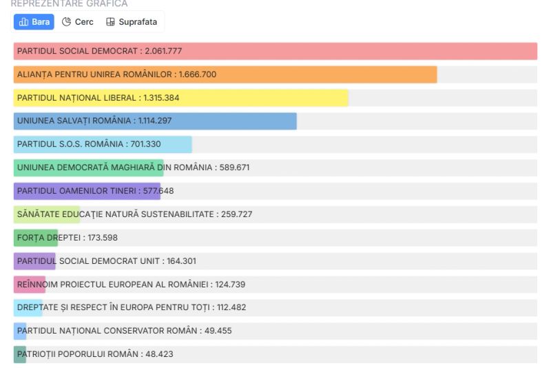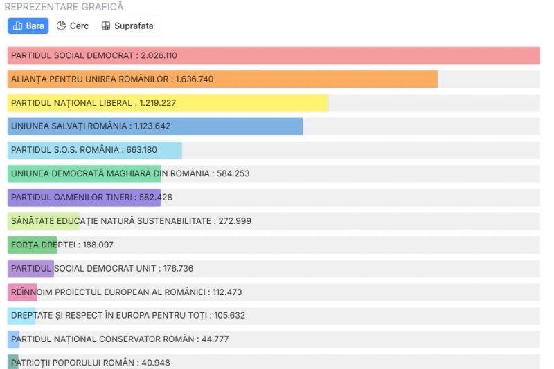La Camera Deputaților, PSD are 2.028.987 de voturi, AUR - 1.657.018, iar PNL - 1.219.693.