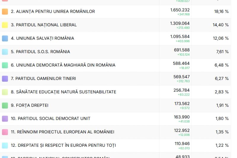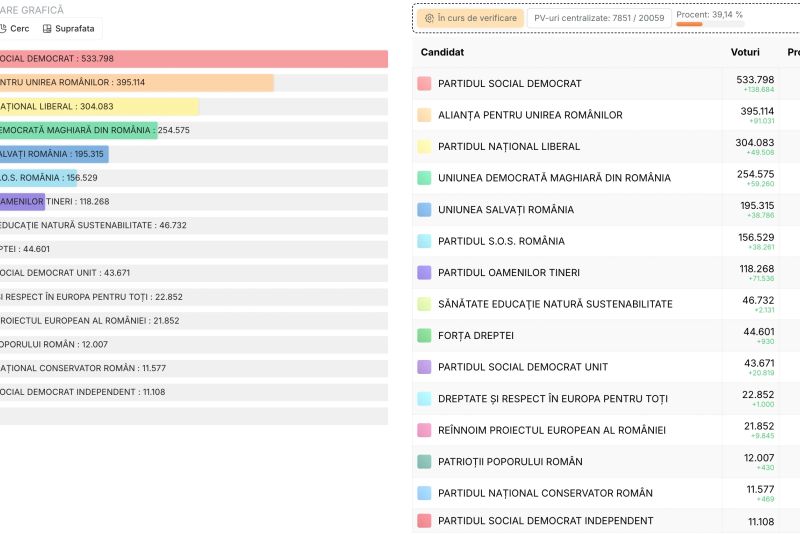 După numărarea a 7851 de procese-verbale dintr-un total de 20.059, reprezentând 39,14%, clasamentul provizoriu de la alegerile parlamentare 2024 este următorul: