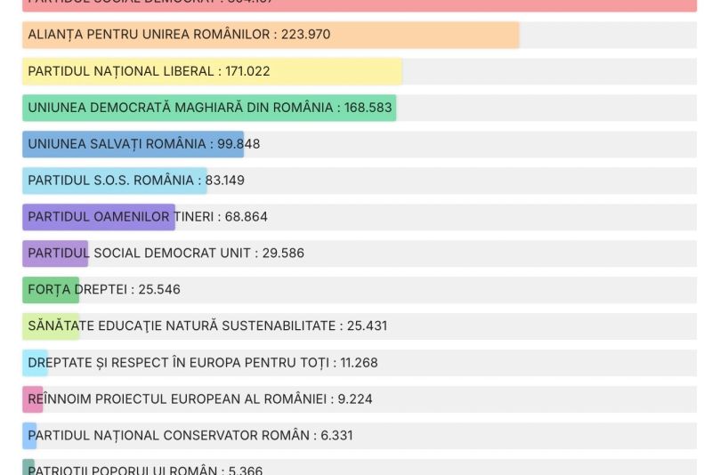 Partidul Social Democrat se situează pe primul loc cu 2.065.007 de voturi și un procent de 22,30 %, urmat de AUR cu 1.694.469 de voturi și un procent de 18,30 %. Pe locul trei se clasează PNL cu 1.322.424 de voturi și un procent de 14,28 %.