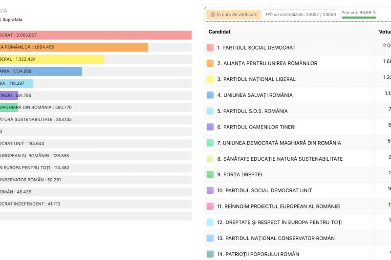 UPDATE 14.00 - PV-uri centralizate: 20055 din 20059. Până la această oră, după 99,98% din voturi, PSD își consolidează poziția cu un procent de 22,31%, urmat de AUR cu 18,29% și de PNL cu 14,29%.