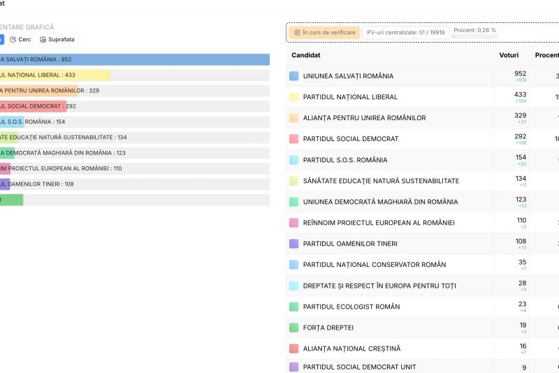 UPDATE ora 21:40 - După centralizarea a 0,26% din procesele-verbale, USR a obținut 952 de voturi, PNL 433 și AUR 329 la Senat.