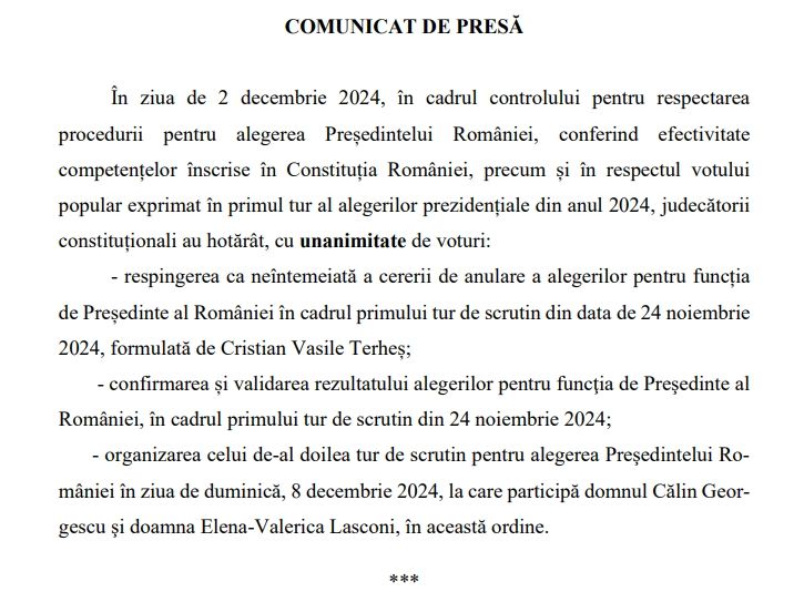 „In cadrul examenului de constitutionalitate, privind respectarea procedurii pentru alegerea presedintelui Romaniei, conferind efectivitatea competentelor inscrise in Constitutia Romaniei, precum si respectul votului popular, exprimata in primul tur al alegerilor prezidentiale din anul 2024, judecatorii constititutionali au hotarat, cu unanimitate de voturi, respingerea ca neintemeiata a contestatiei candidatului Terhes Cristian Vasile.