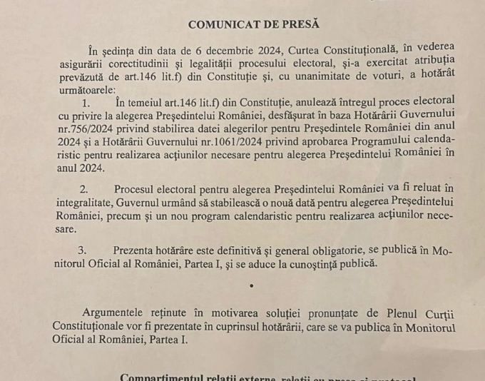 1. În temeiul art.146 lit.f) din Constituție, anulează întregul proces electoral cu privire la alegerea Președintelui României, desfășurat în baza Hotărârii Guvernului nr.756/2024 privind stabilirea datei alegerilor pentru Preşedintele României din anul 2024 și a Hotărârii Guvernului nr.1061/2024 privind aprobarea Programului calenda-ristic pentru realizarea acţiunilor necesare pentru alegerea Preşedintelui României în anul 2024.