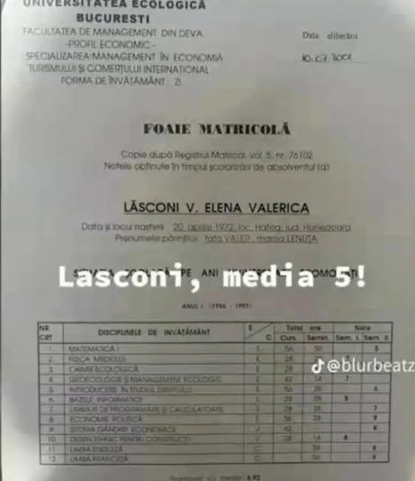 Cât privește notele obținute, potrivit foii matricole, la Matematică a avut nota 5. De asemenea, a avut nota 5 și la Chimie ecologică, dar și la Bazele informaticii.
