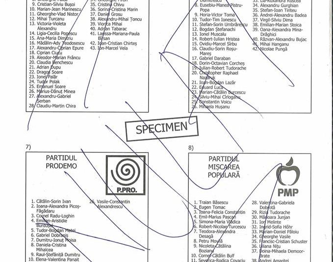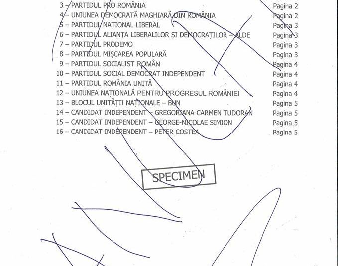 Cum arată buletinul de vot. În primul rând, trebuie să știți că buletinul de vot pentru alegerile europarlamentare 2019 are 8 (opt) pagini, în total, astfel: pe prima pagină, numită copertă, se menționează faptul că buletinul de vot respectiv servește alegerii membrilor României în Parlamentul European; pe a doua pagină, găsim o legendă cu explicații: putem alege din 13 formațiuni politice și 3 candidați independenți (în total avem 16 opțiuni); pe următoarele 4 pagini ale buletinului de vot sunt chenare cu însemnele partidelor și alianțelor politice în care sunt trecute NUMELE tuturor candidaților de pe listele de vot. În ultimele 3 chenare apar independenții; ultimele două pagini ale buletinului de vot sunt GOALE.
