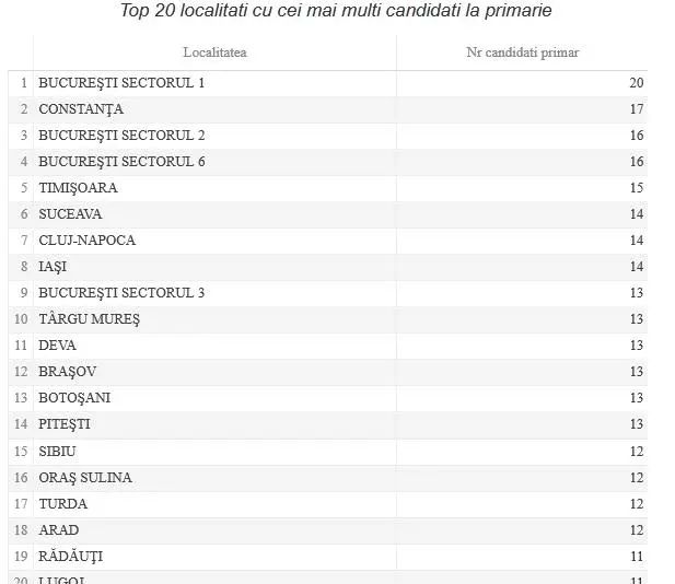 Urmează Constanța, cu 17 candidați înscriși pe listă la alegeri locale 2020, București sectorul 2 și sectorul 6, fiecare cu câte 16 candidați, dar și Timișoara, cu 15 candidați.