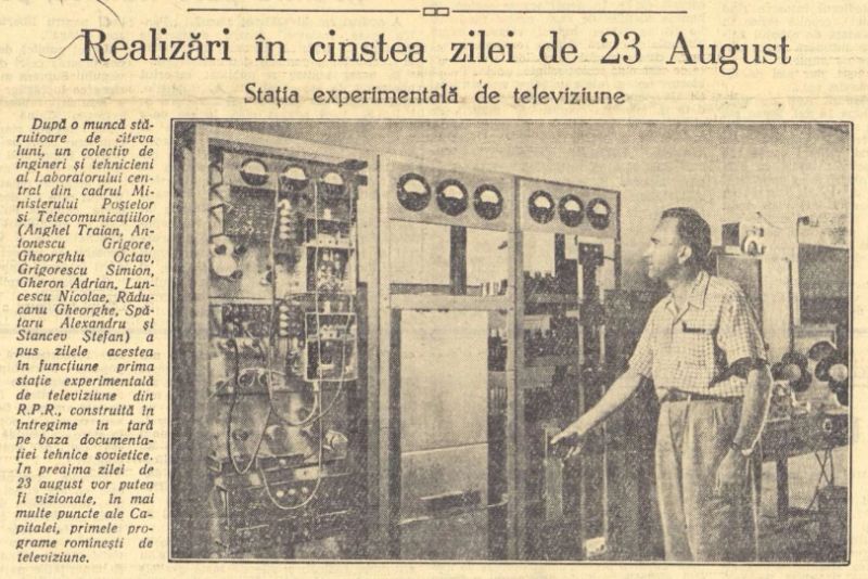 sursă: Scînteia, 7 august 1955/Ziare Arcanum"După o muncă stăruitoare de cîteva luni, un colectiv de ingineri şi tehnicieni al Laboratorului central din cadrul Ministerului Poştelor şi Telecomunicaţiilor a pus zilele acestea In funcţiune prima stafie experimentală de televiziune din R.P.R., construită în întregime în țară pe baza documentaţiei tehnice sovietice. In preajma zilei de 23 august vor putea fi vizionate, in mai multe puncte ale Capitalei, primele programe românești de televiziune", transmitea "Scînteia" la începutul lunii august.Televiziunea Română a început să emită regulat abia din ziua de 31 decembrie 1956 într-un studio improvizat pe strada Moliere, din cartieul Floreasca.