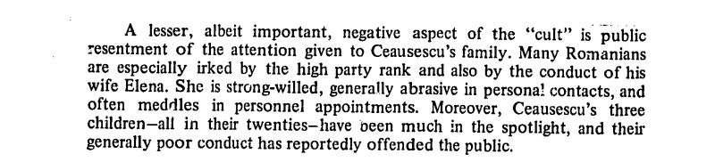 Serviciile secrete americane aveau încă de la mijlocul anilor `70 o impresie mai degrabă proastă și estimări pesimiste legate de viitorul lui Nicolae Ceaușescu și al regimului pe care-l controla. Mai mult, CIA o indica pe Elena Ceaușescu drept una dintre "vulnerabilități" și o cauză a amplificării cultului personalității.