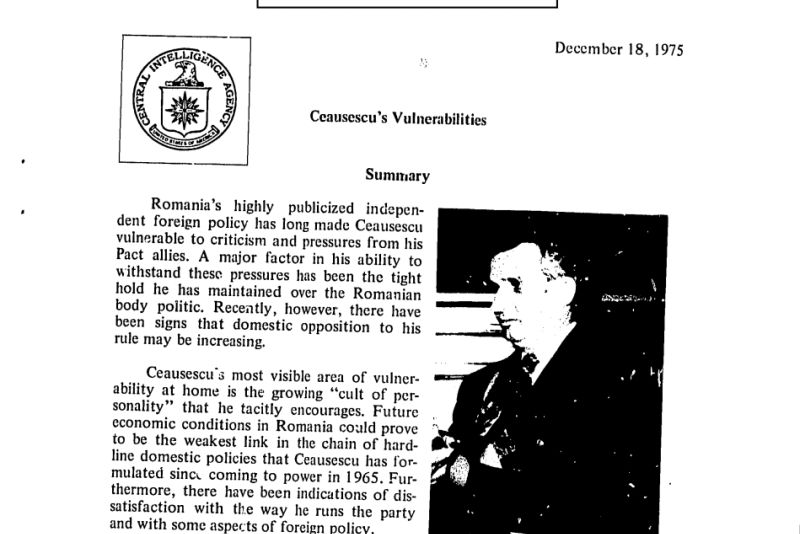 "Evoluțiile viitoare ale economie s-ar putea dovedi veriga slabă în lanțul politicilor autoritare formulate de Ceaușescu încă de la venirea la putere, în 1965. Chiar și așa, poziția sa este suficient de puternică încât să-i permită să depășească orice provocări interne," mai scria CIA în decembrie 1975.