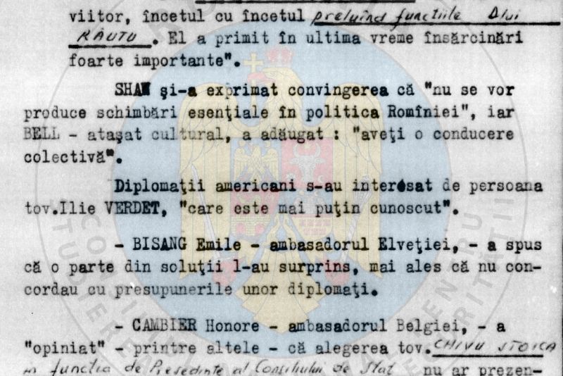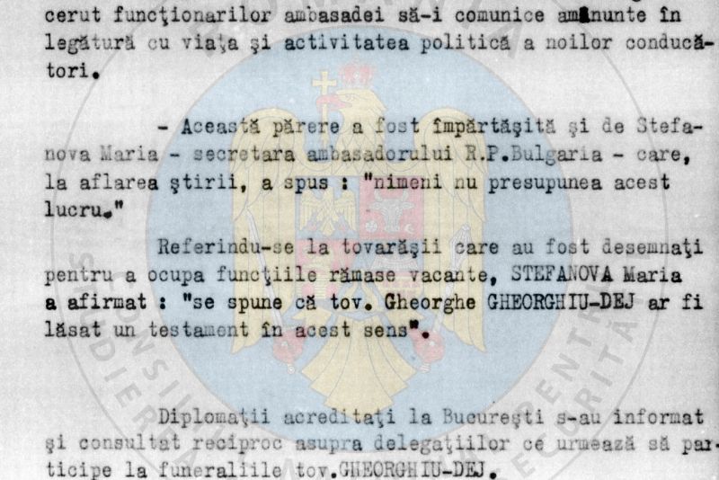 Interesantă este solicitarea secretarei ambasadei Bulgariei, care ar fi afirmat într-o discuție că, din câte știe, "tovarășul Gheorghiu-Dej ar fi lăsat un testament în acest sens (al succesiunii la conducerea României - N.A.)".