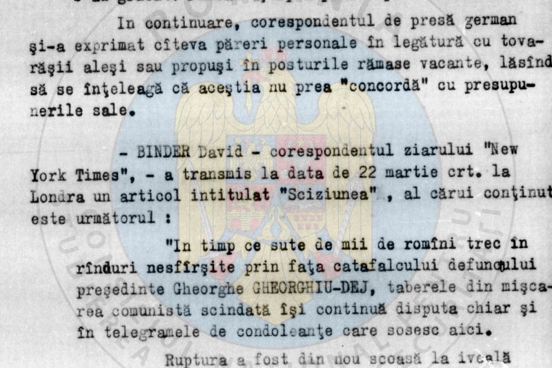 Luptele pentru putere au stârnit întotdeauna interesul cercetătorilor și jurnaliştilor, dar au fascinat şi publicul. Astfel de situații au fost cu atât mai interesante în regimurile totalitar-comuniste, în condițiile în care cei din tabăra învinsă au plătit deseori cu libertatea sau chiar cu viața. O situație interesantă s-a produs în urmă cu 59 de ani, la moartea primului lider comunist al României, Gheorghe Gheorghiu-Dej. Pentru a marca momentul, Consiliul Național pentru Studierea Arhivelor Securității a publicat o serie de documente care surprind opiniile din cercurile diplomatice străine în perioada succesiunii de la vârful Partidului Muncitoresc Român.