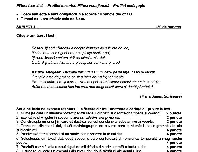 SUBIECTE ROMÂNĂ BACALAUREAT 2016. Subiectul I cere analizarea unei poezii de Maria Bănuș.