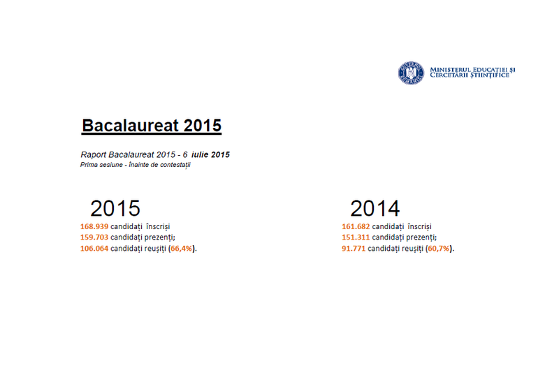 Ministerul Educaţiei şi Cercetării Ştiinţifice a centralizat marţi, 7 iulie, rezultatele înregistrate în sesiunea iunie-iulie 2015 a examenului de Bacalaureat. Astfel, în această sesiune au promovat 106.064 (66,41%) de absolvenţi de clasa a XII-a: 100.058 (72,78%) provin din promoţia curentă şi 6.006 (27,02%) din promoţiile anterioare. Comparativ cu aceeaşi sesiune a anului trecut, se constată un plus de 14.293 de elevi care au reuşit să promoveze examenul.