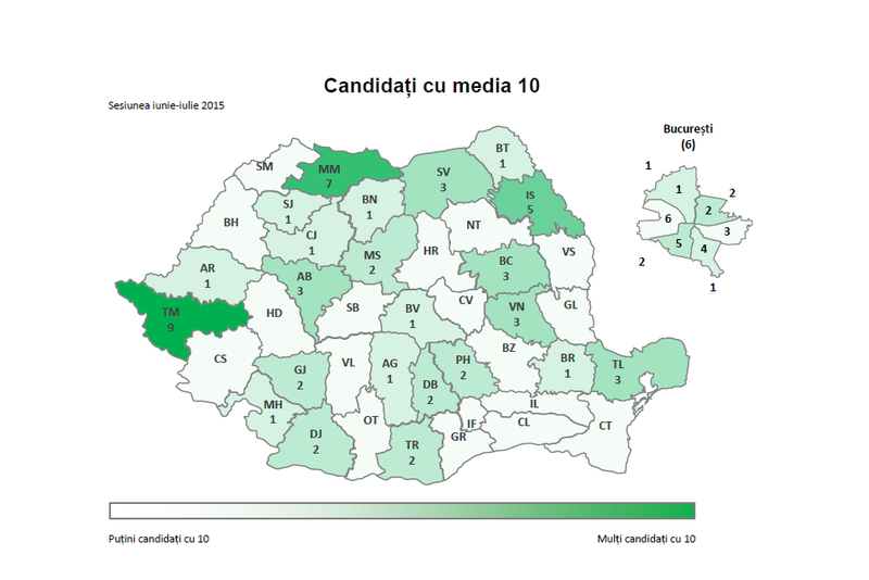 La nivelul întregii ţări, s-au înregistrat 63 de medii de 10 (cele mai multe - 9 - în judeţul Timiş), în scădere comparativ cu anul trecut (104).