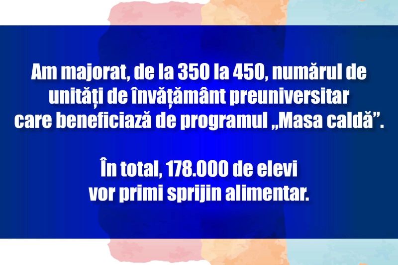 "Astăzi a fost adoptată, în Guvernul României, ordonanța de urgență care majorează, de la 350 la 450, numărul de unități de învățământ preuniversitar care beneficiază de programul „Masa caldă”.