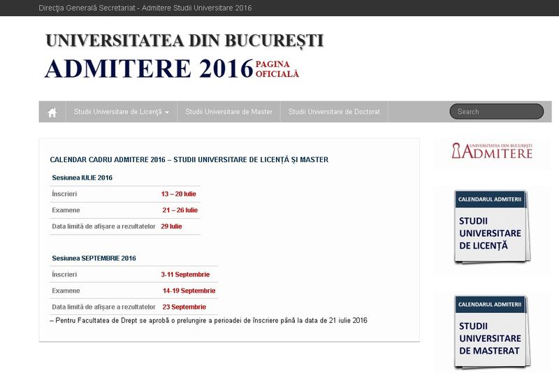 Data limită pentru înscrierea la facultățile Universității din București este 20 iulie 2016, iar la Facultatea de Drept înscrierile se pot face până la data de 21 iulie 2016.
