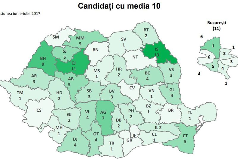 La nivel național, cele mai ridicate procente de promovare (83%+) s-au înregistrat în judeţele Bacău (84,53% comparativ cu 83,54% înainte de contestații), Sibiu (84,39% comparativ cu 83,73%), Iași (84,10% comparativ cu 82,91%) și Cluj (83,65% comparativ cu 82,75%). Rata finală de promovare în Capitală este de 75,83% (în creştere de la 74,09%). Judeţele în care rata de promovare a rămas sub 55% sunt Ilfov (44,31%) şi Giurgiu (51,96%).